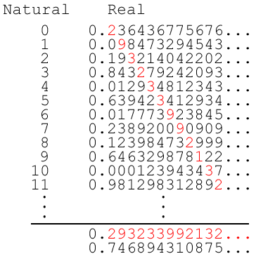 Techniquement, ce tableau permet d'établir la bijection dont je viens de parler. Sauf que si l'on prend les chiffres coloriés en rouge sur la diagonale et qu'on les utilise pour créer un nouveau nombre décimal entre 0 et 1 puis qu'on change chacun de ses chiffres. Eh bien nous avons la garantie que ce nombre n'a pas déjà été utilisé dans le tableau. Après tout, son dixième est différent de celui du premier nombre, son centième du deuxième...etc.