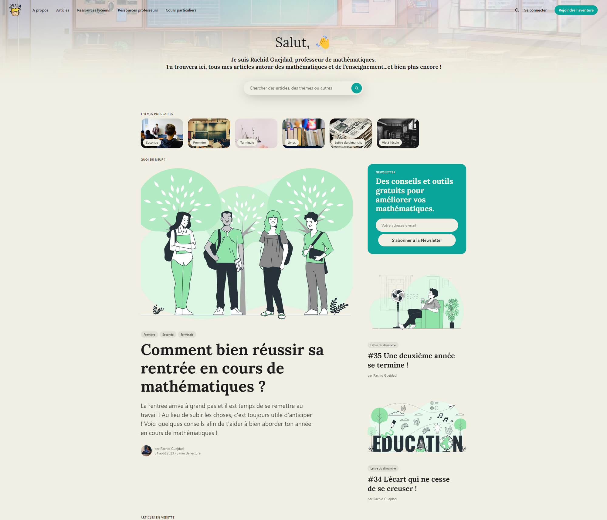 - Plus d'articles : L'année dernière, je me suis contenté d'écrire la lettre du dimanche. La Newsletter rencontre un franc succès (vous êtes quelques centaines à la lire), mais c'était une sorte de pêle-mêle de sujets divers et variés. À partir de maintenant, je vais commencer à écrire des articles plus spécialisés : sujets mathématiques poussés, des notions d'approfondissement par niveau, des articles sur la pédagogie et la vie à l'école, des recommandations de livres...