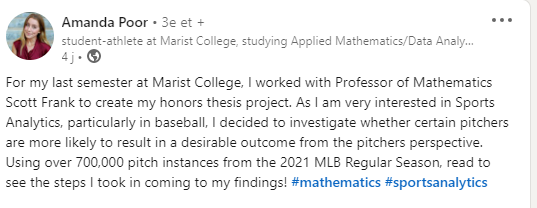 L'étude consiste à évaluer quel type de lancé donne les résultats désirés par le lanceur grâce à l'étude statistique de tous les lancés du championnat en 2021. Je vais essayer de la contacter via LinkedIn pour en savoir plus sur sa motivation pour ce sujet en particulier.